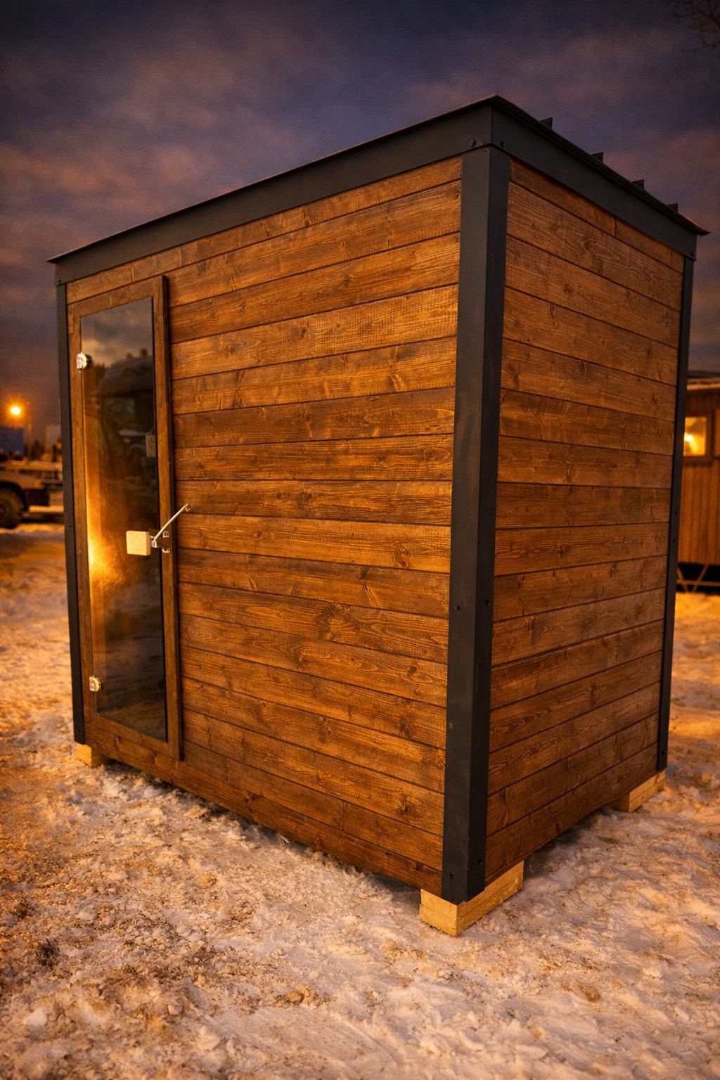 - Die Kombination aus natürlichem Fichtenholz und modernen Blechelementen verleiht der Sauna ein elegantes, zeitloses Aussehen