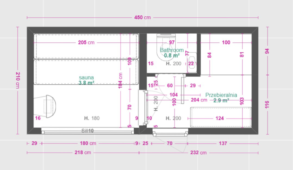 - Außenmaße: Breite 210 x 450 cm, Höhe 230 cm