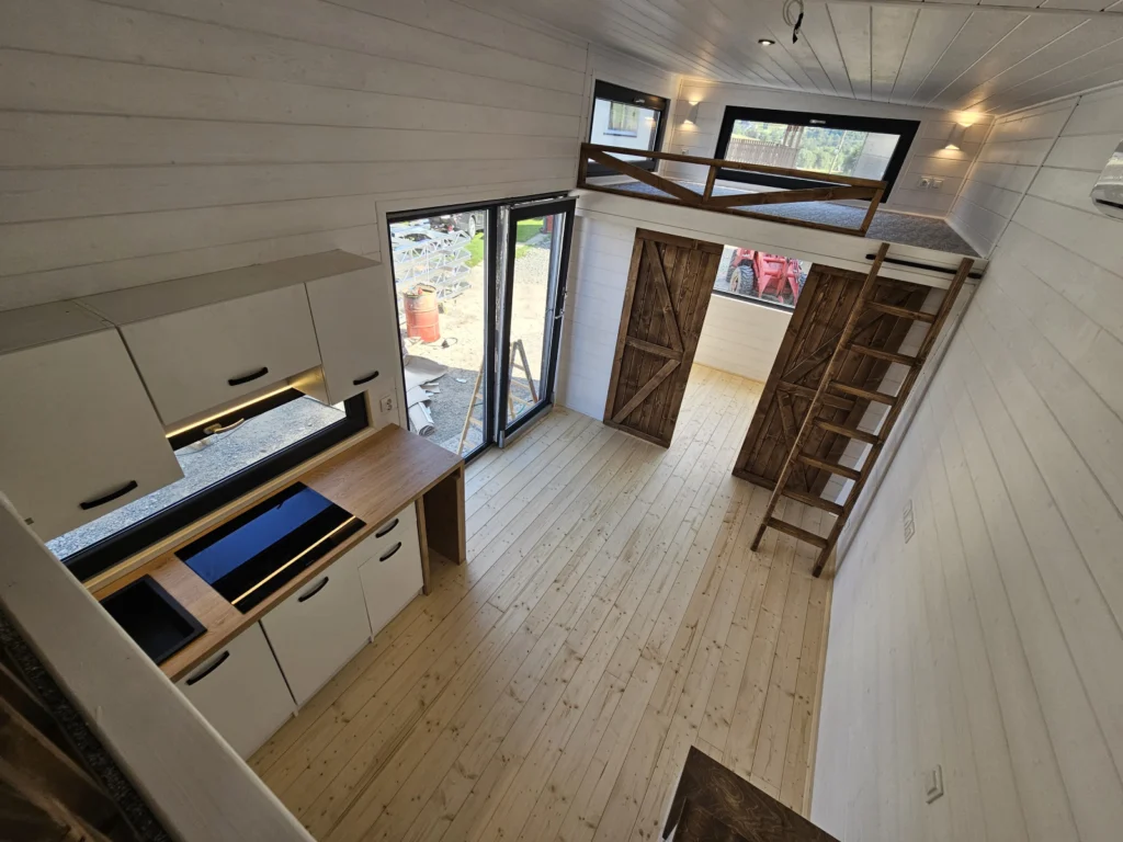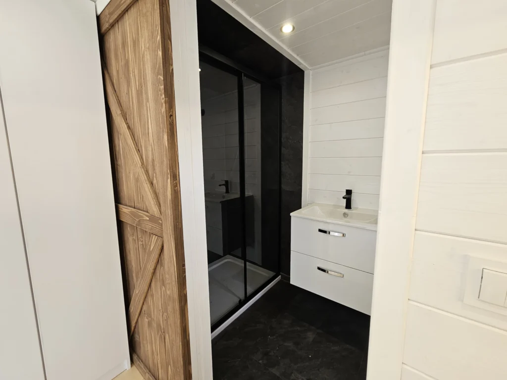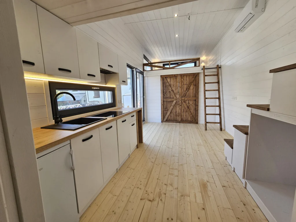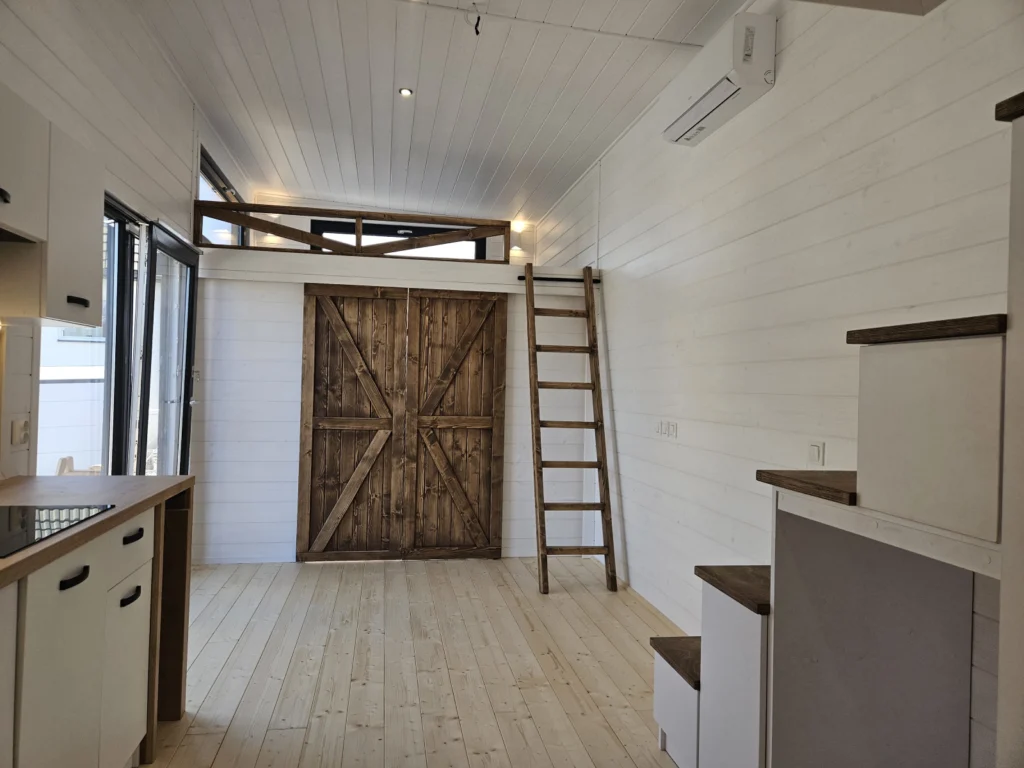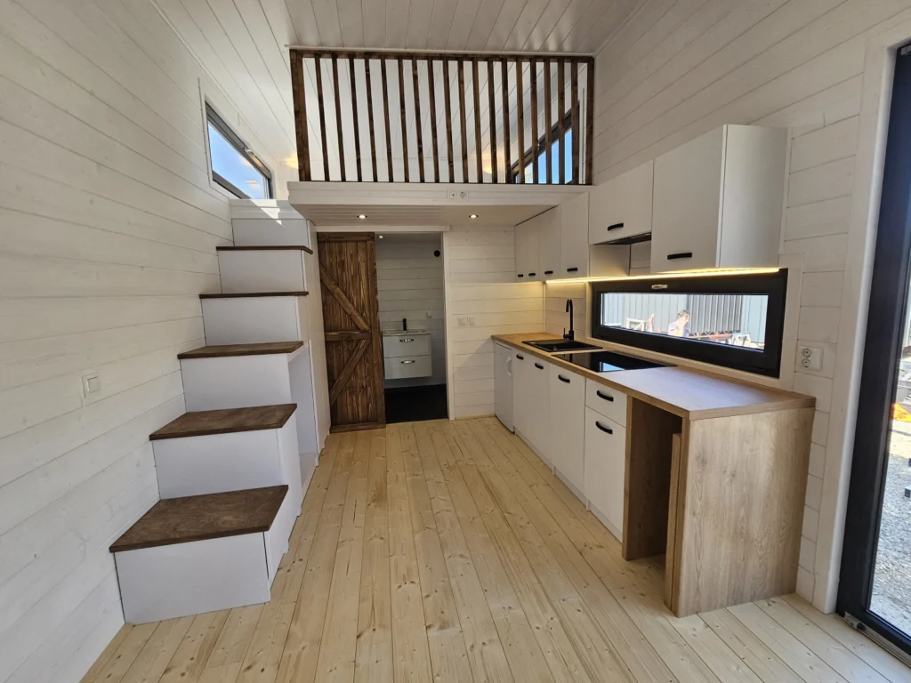 - Das Interieur ist in Weiß und Naturholz gehalten, mit Türen aus dunklen Brettern.