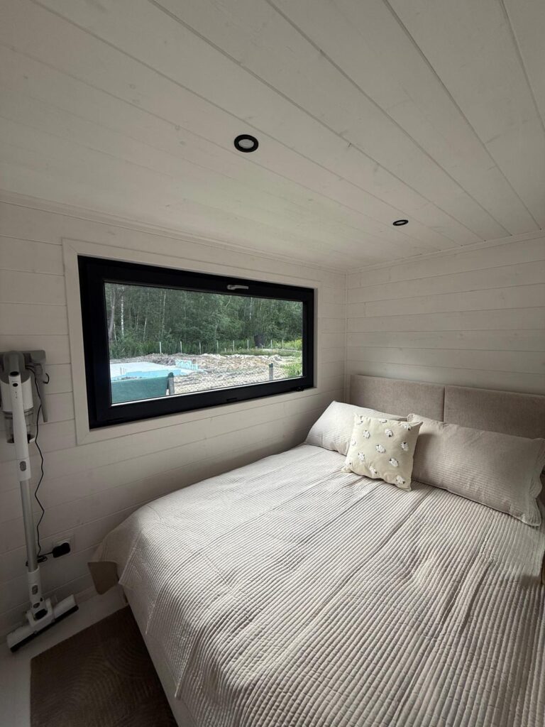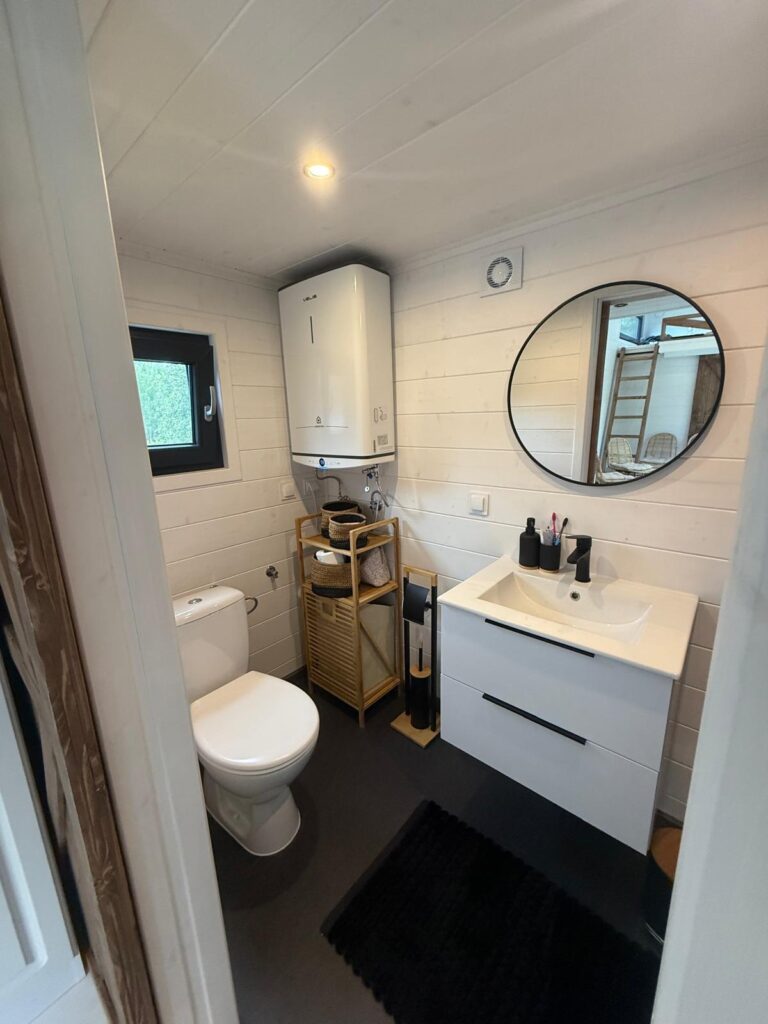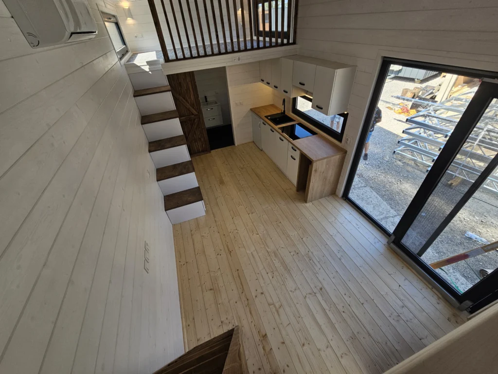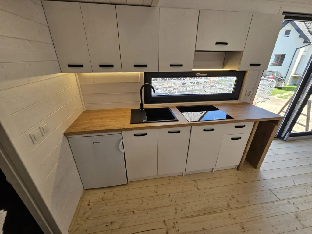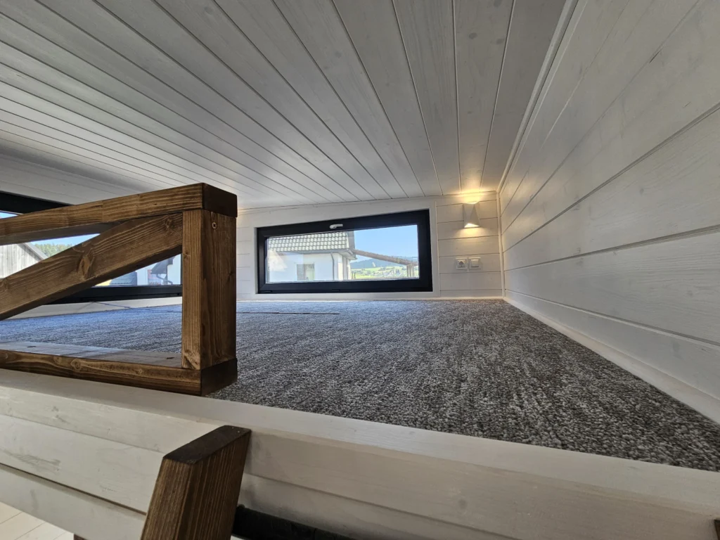 - Das Interieur ist in Weiß und Naturholz gehalten, mit Türen aus dunklen Brettern.