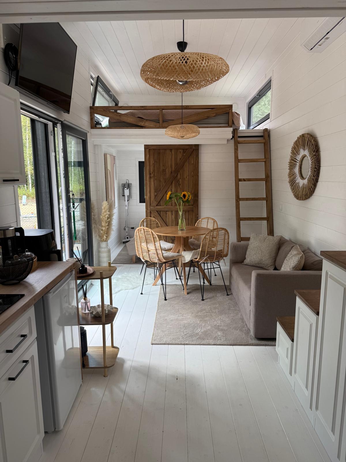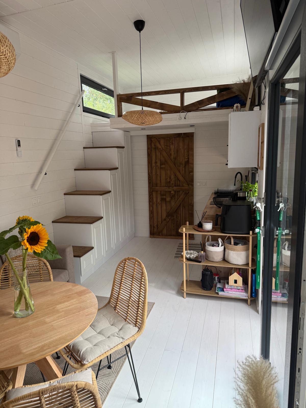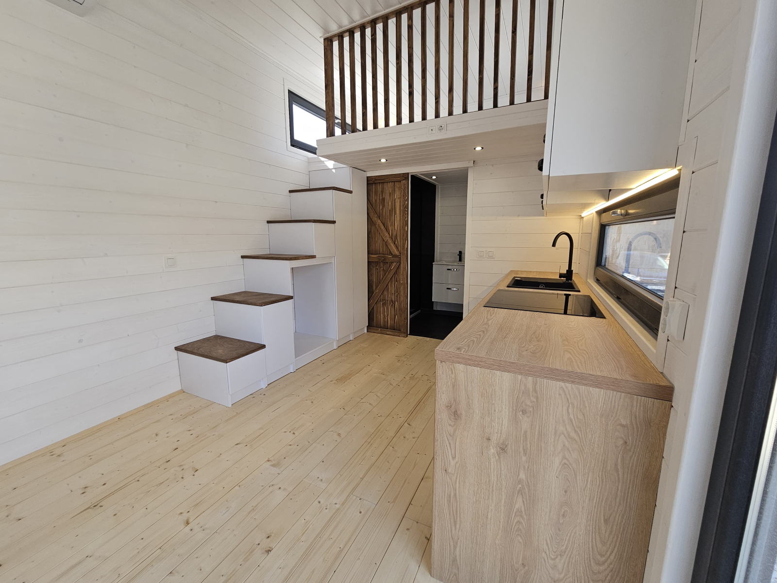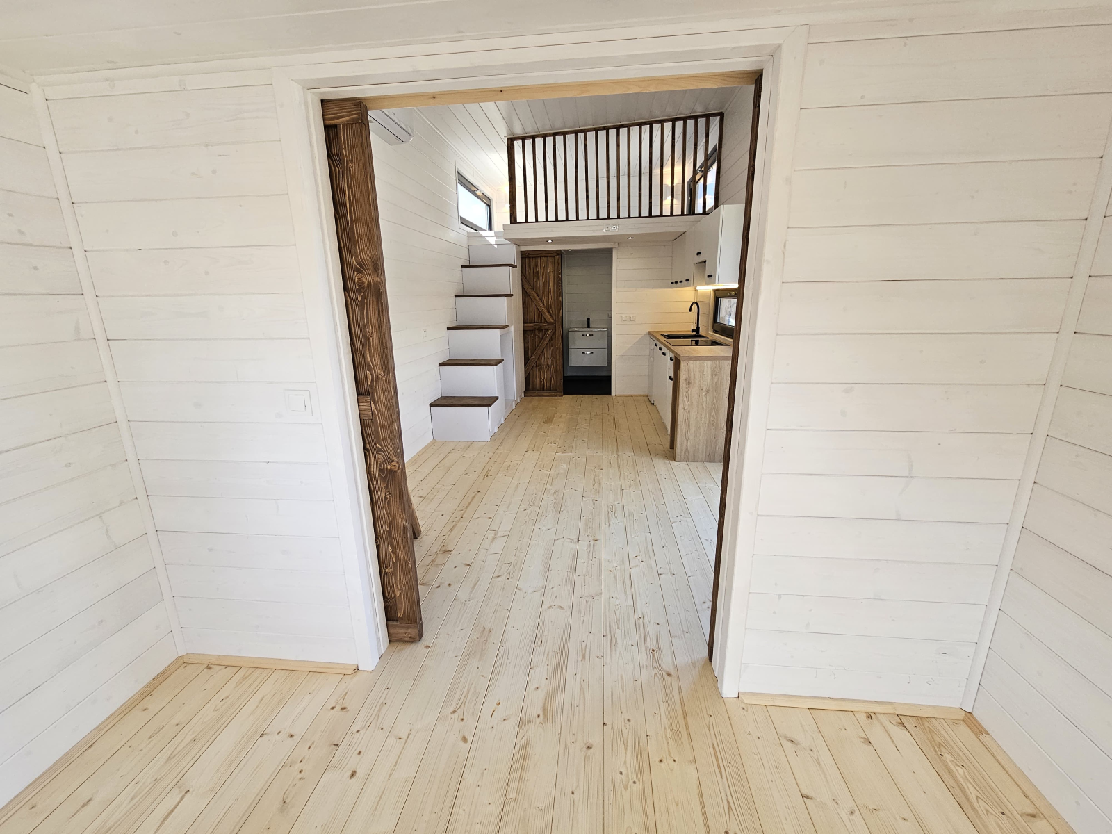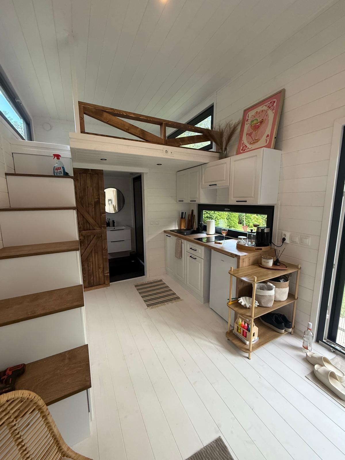 - Das Interieur ist in Weiß und Naturholz gehalten, mit Türen aus dunklen Brettern.