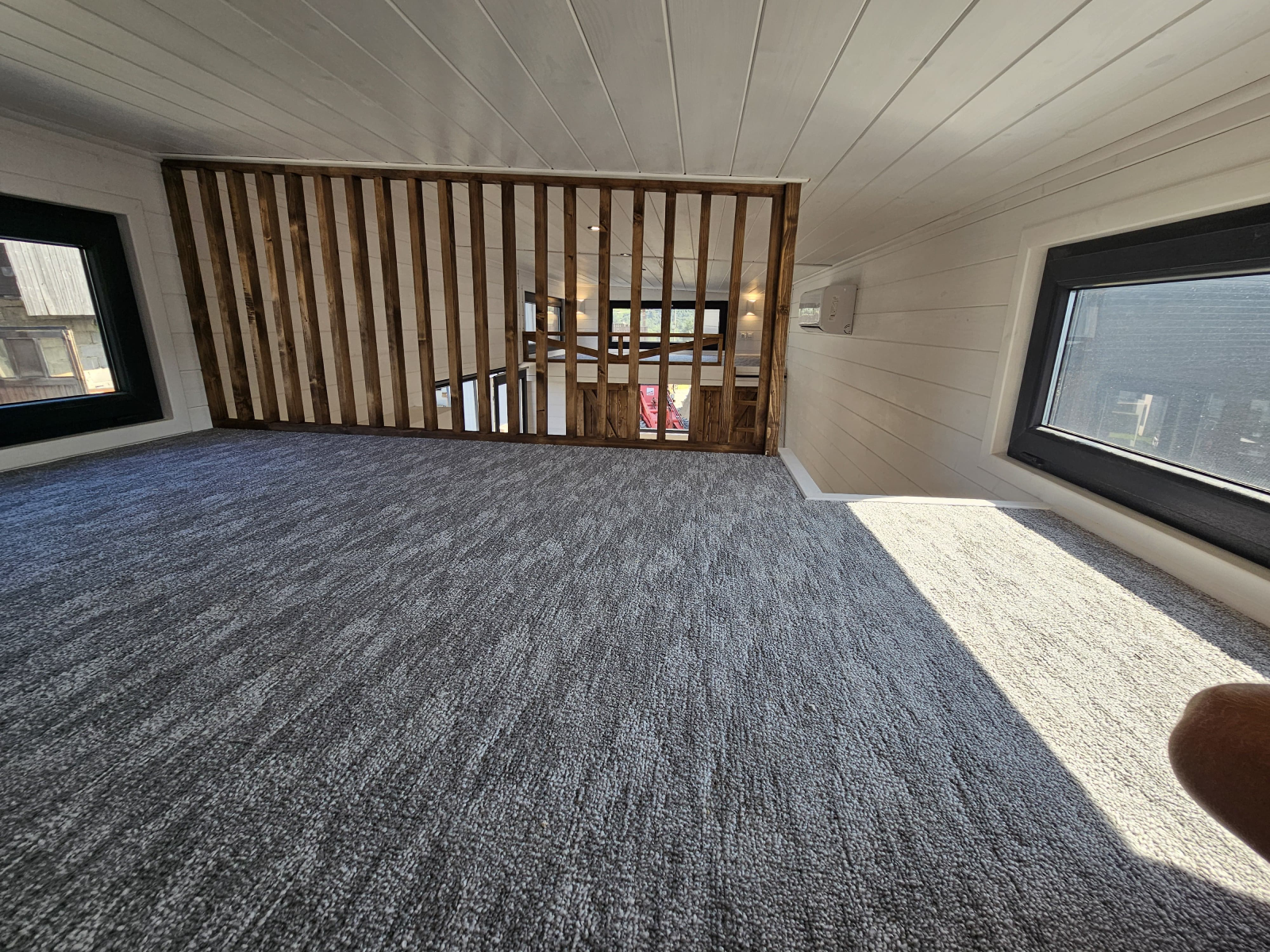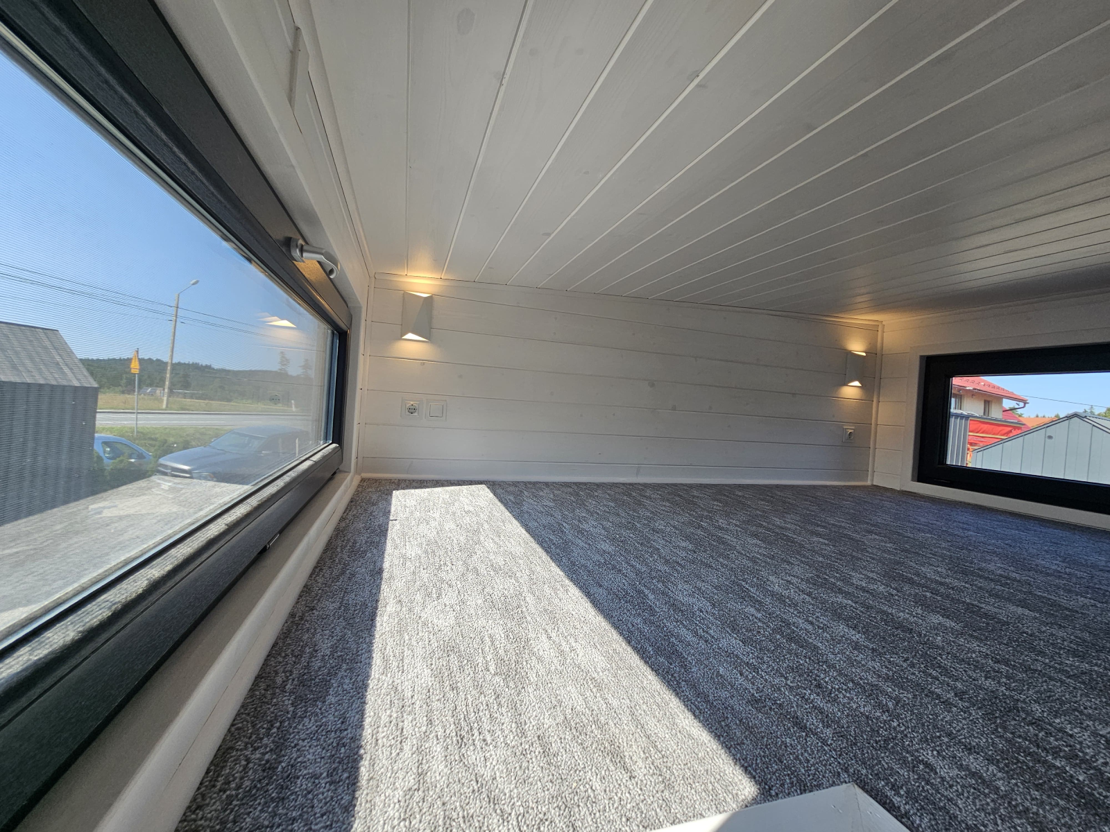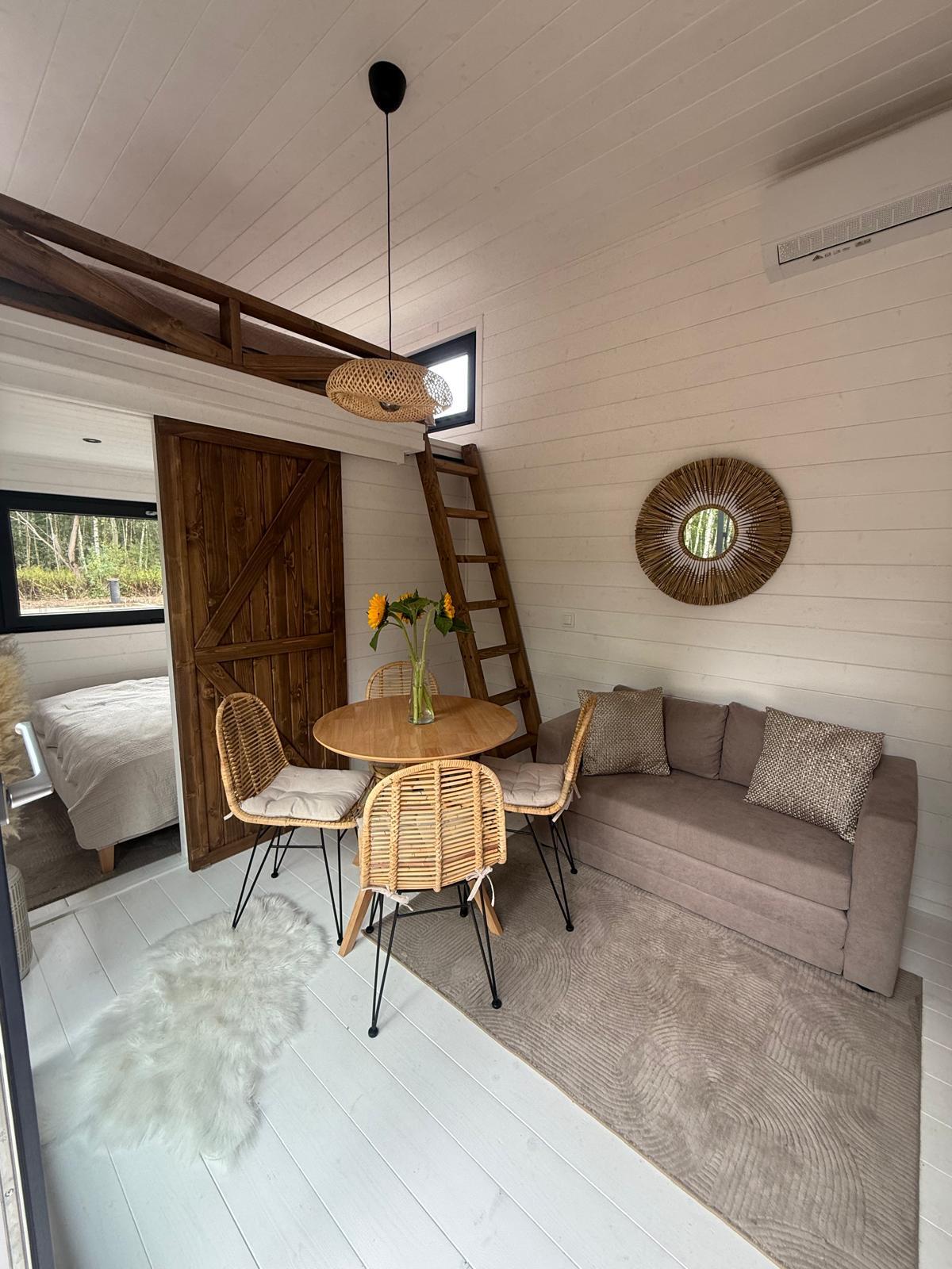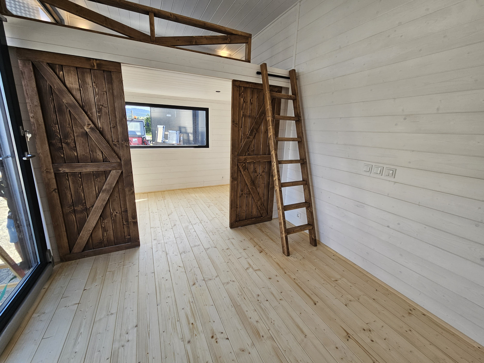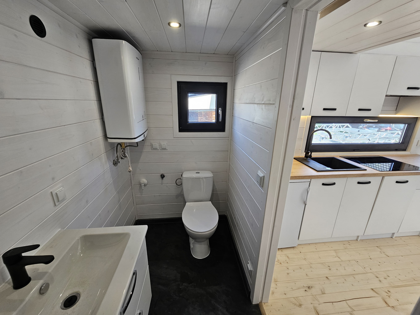 - Das Interieur ist in Weiß und Naturholz gehalten, mit Türen aus dunklen Brettern.