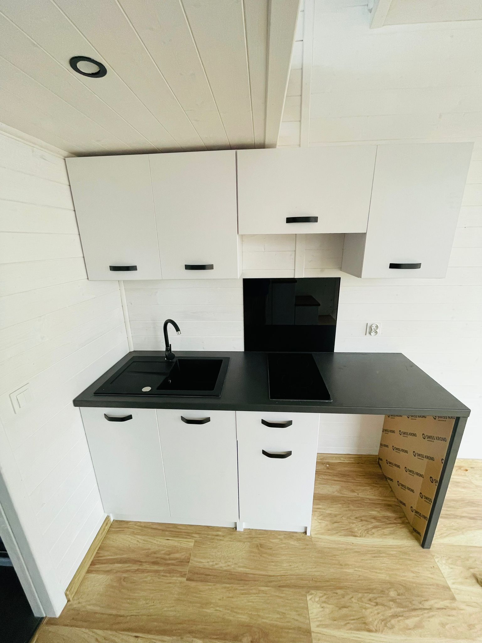 - Küchenzeile mit Elektroherd mit zwei Kochplatten und Spüle, Möbel, Stauraum, Kücheneinrichtung mit gefrästen Fronten;